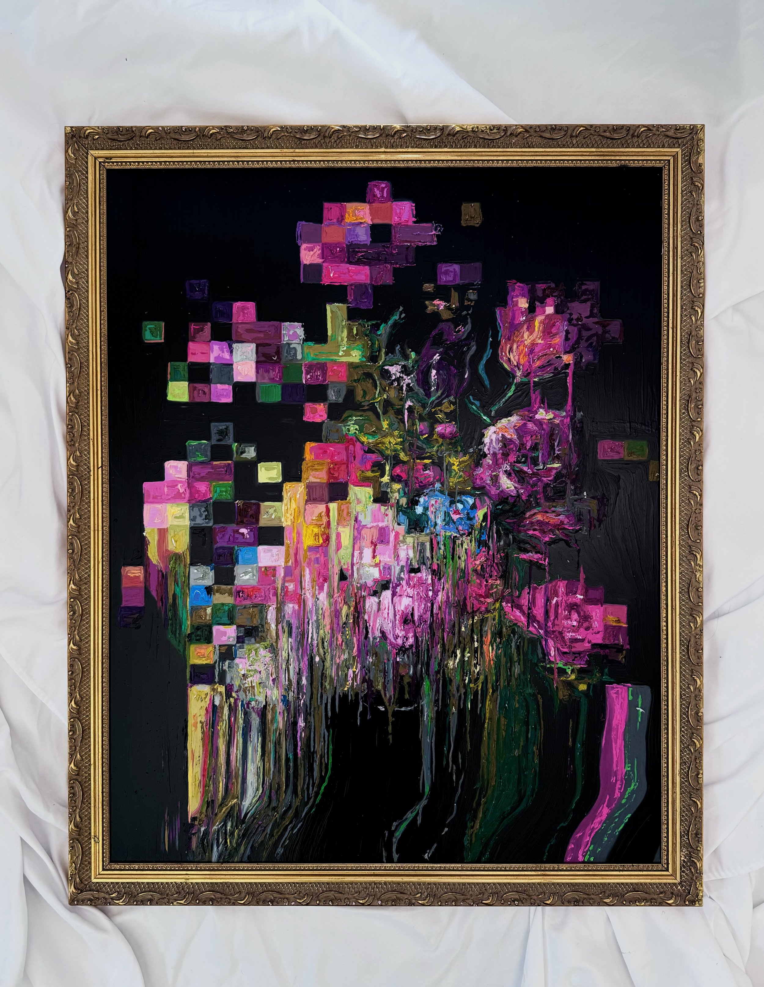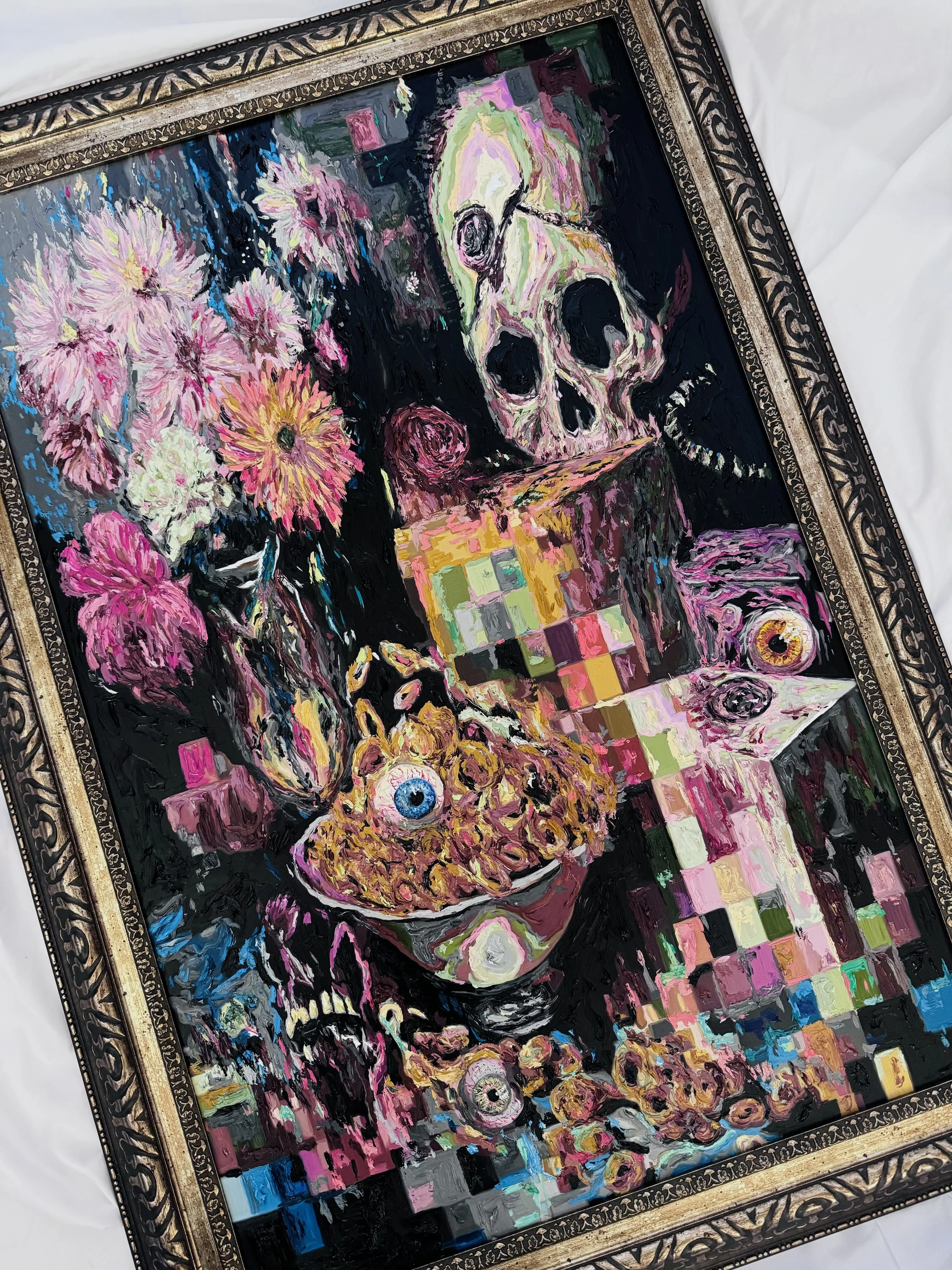 Oil paint on glass panel with mixed media (plaster, fake flowers, spray paint, fake flies) - January-April 2025