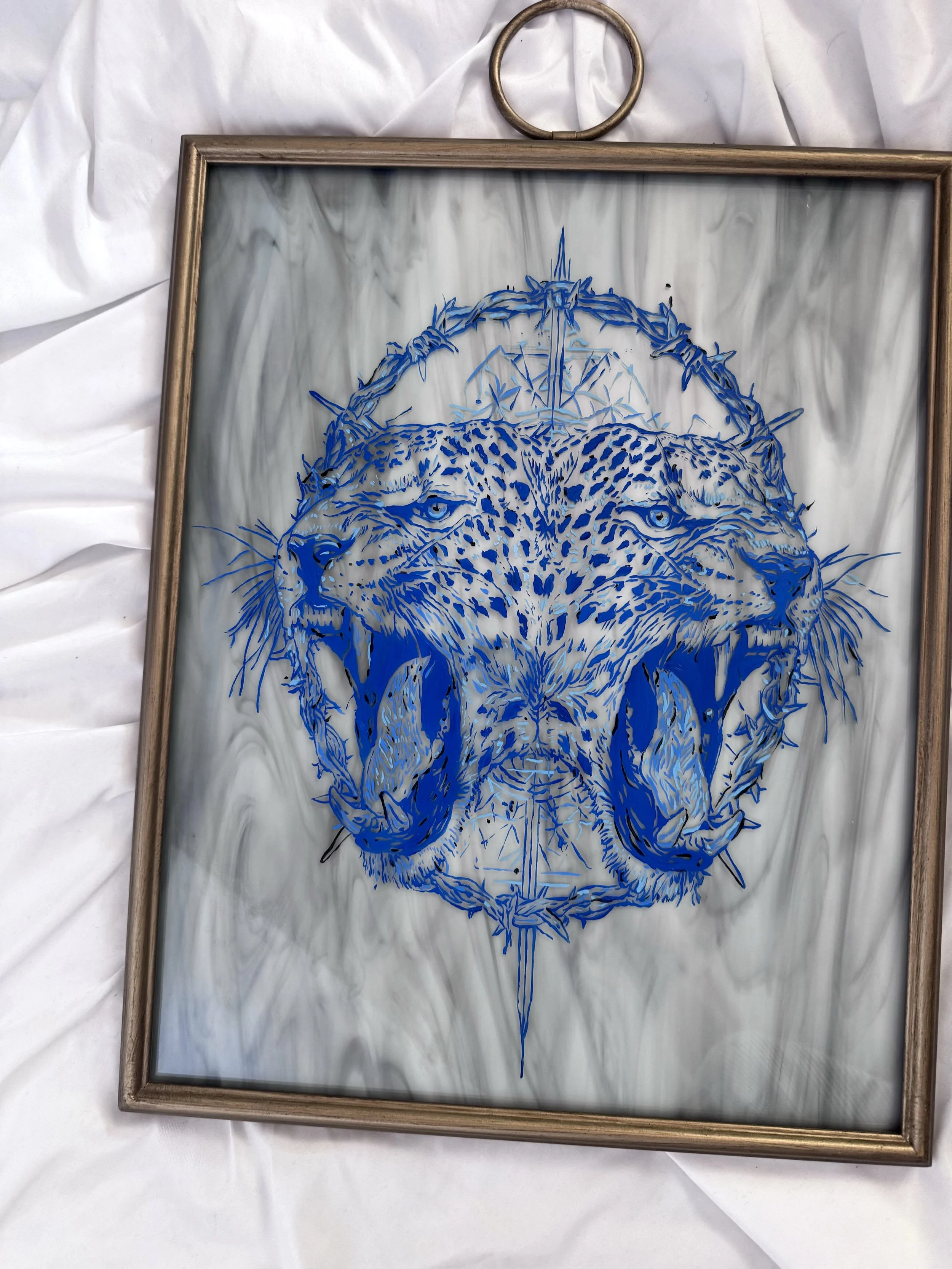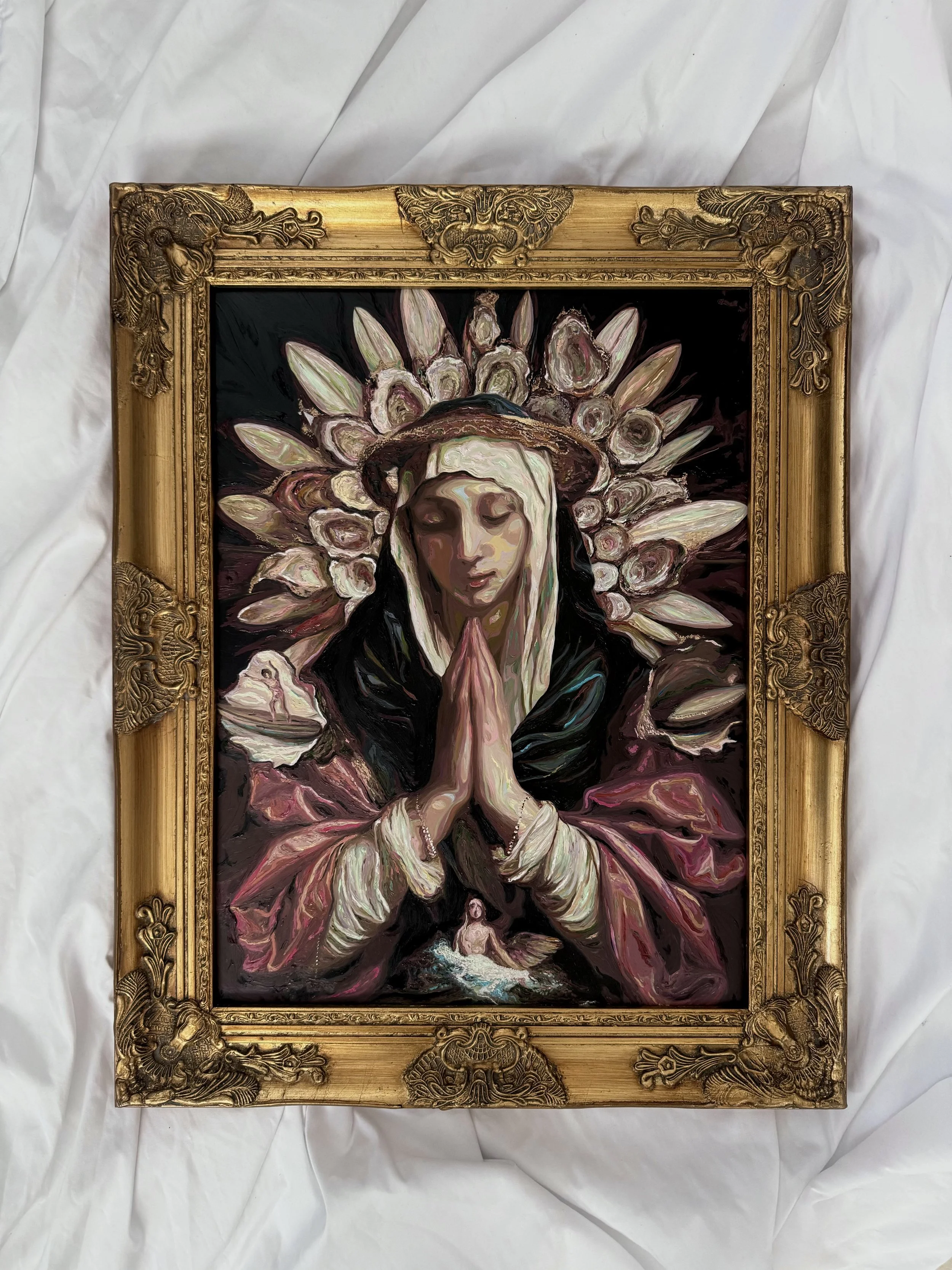 Oil paint on glass panel with handmade shark teeth frame September-November 2024