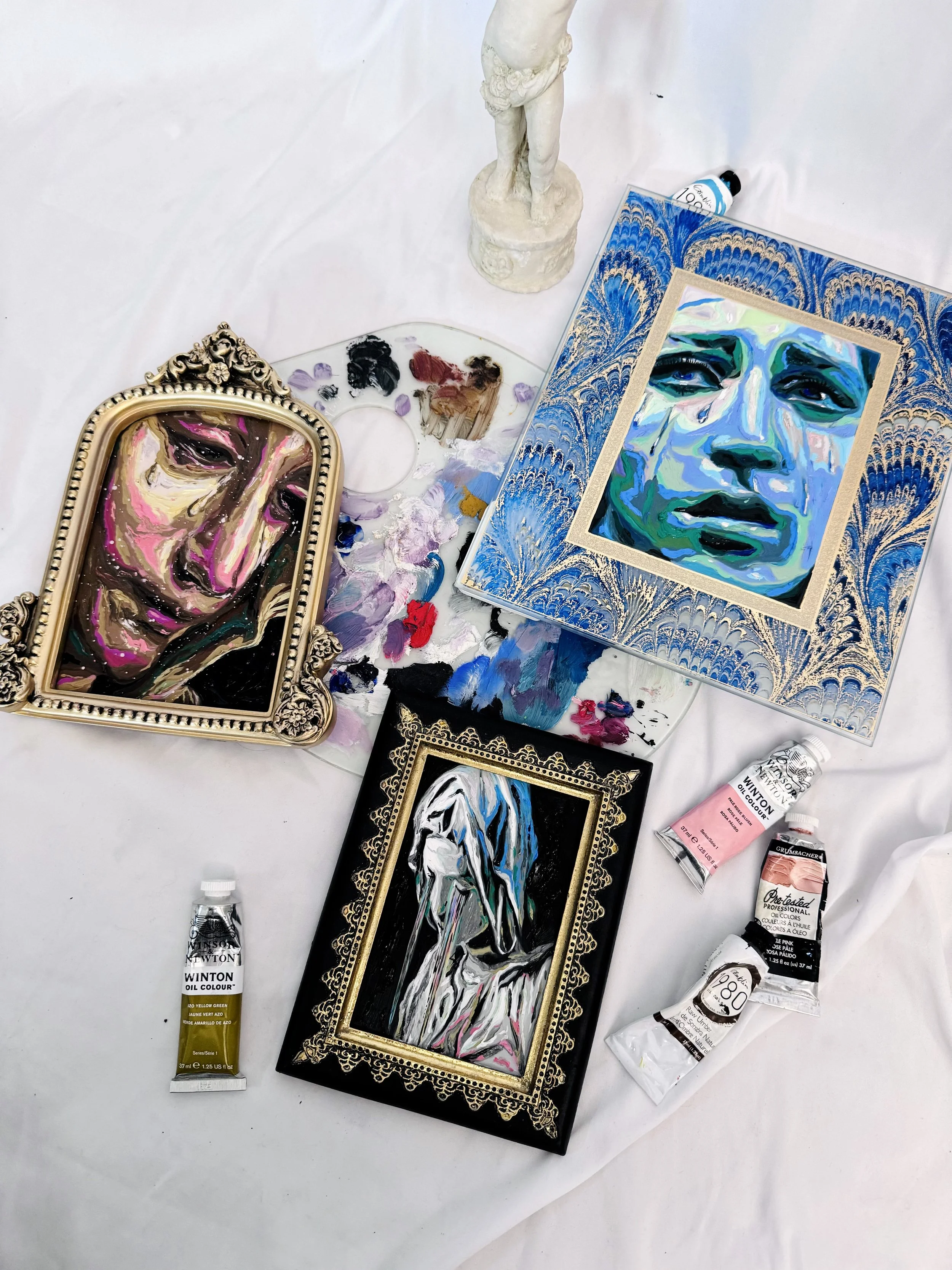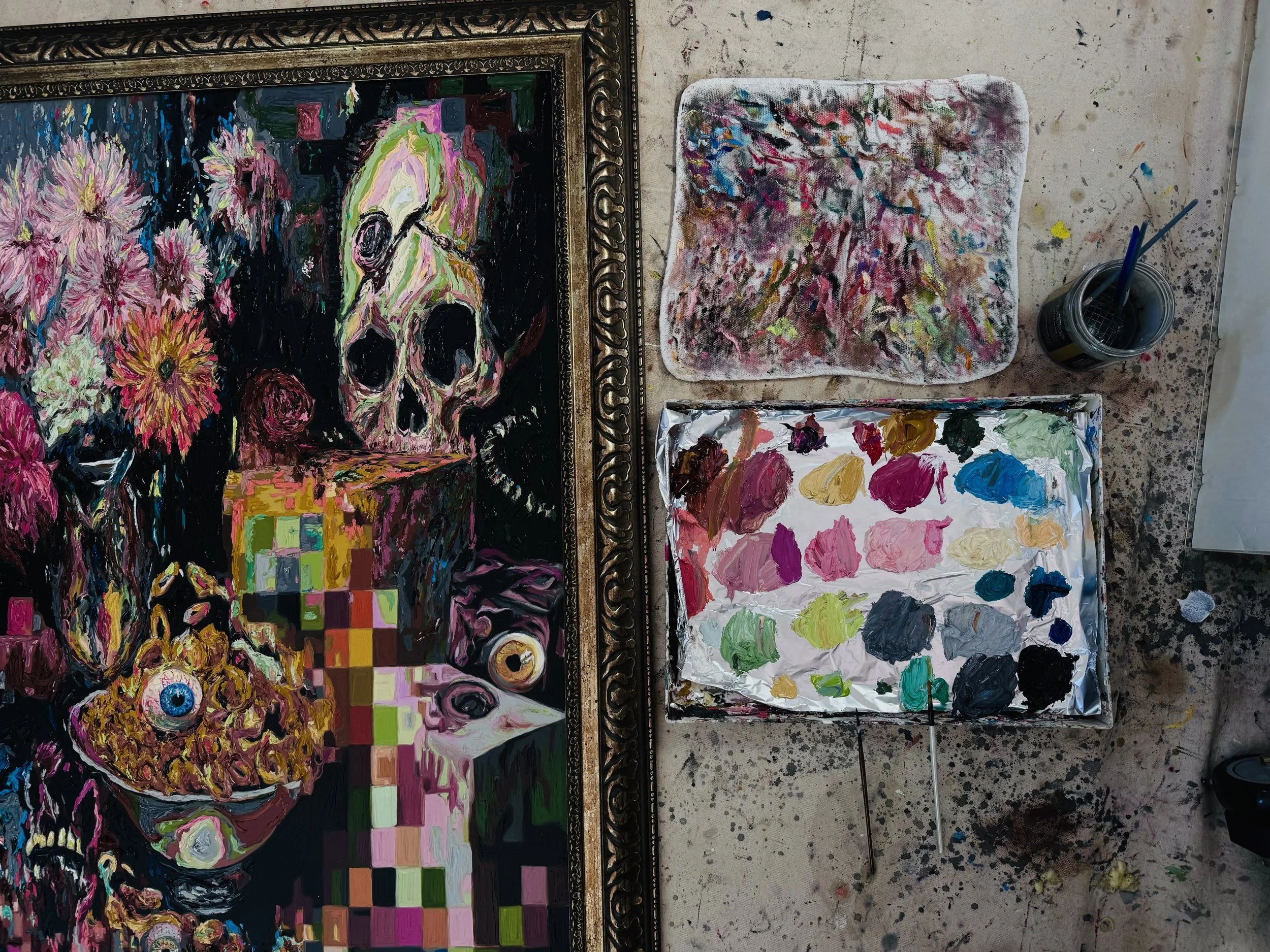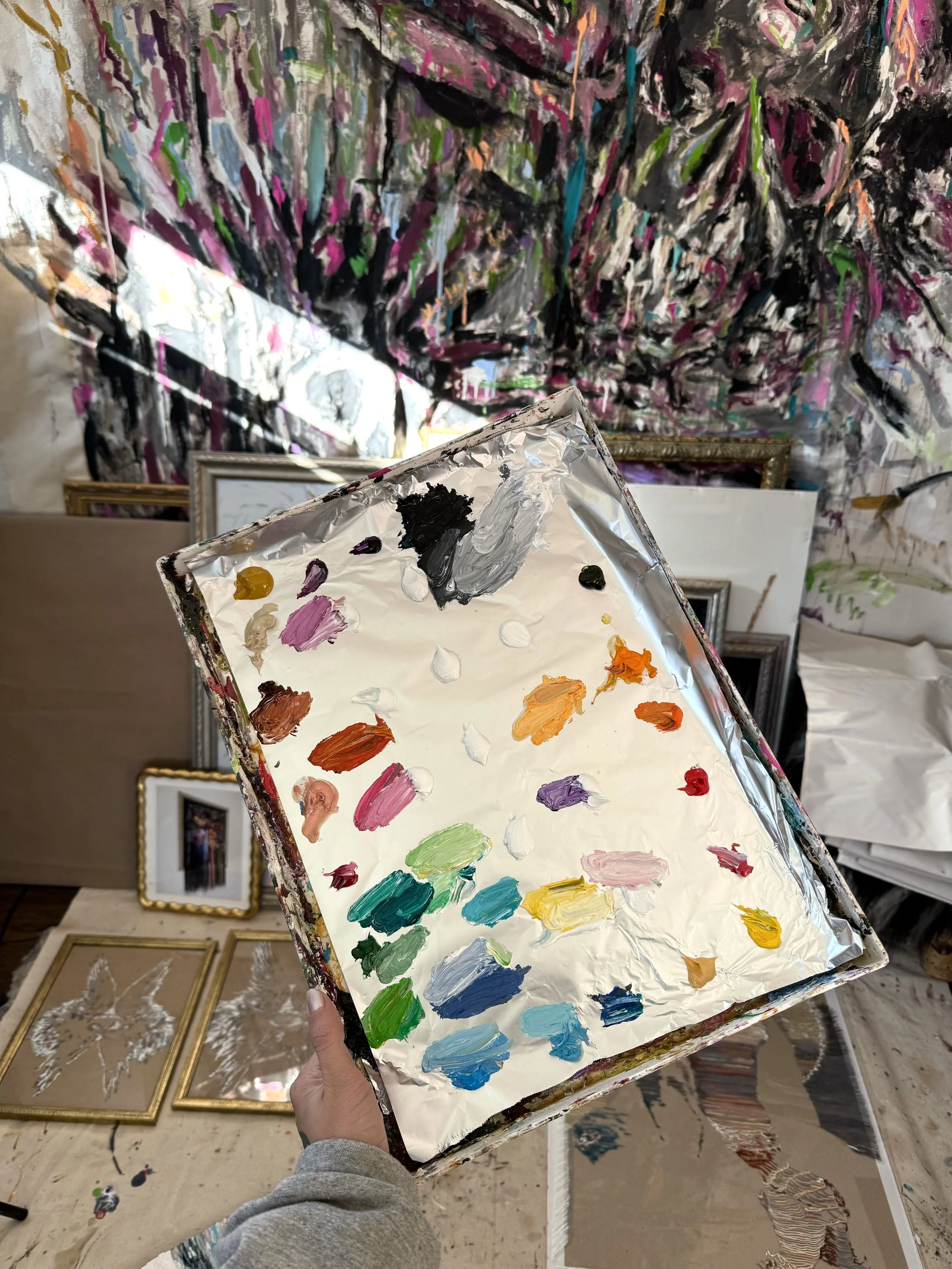 Studio floor (Butterfly people finishing with scattered mini paintings) OCT 2024
